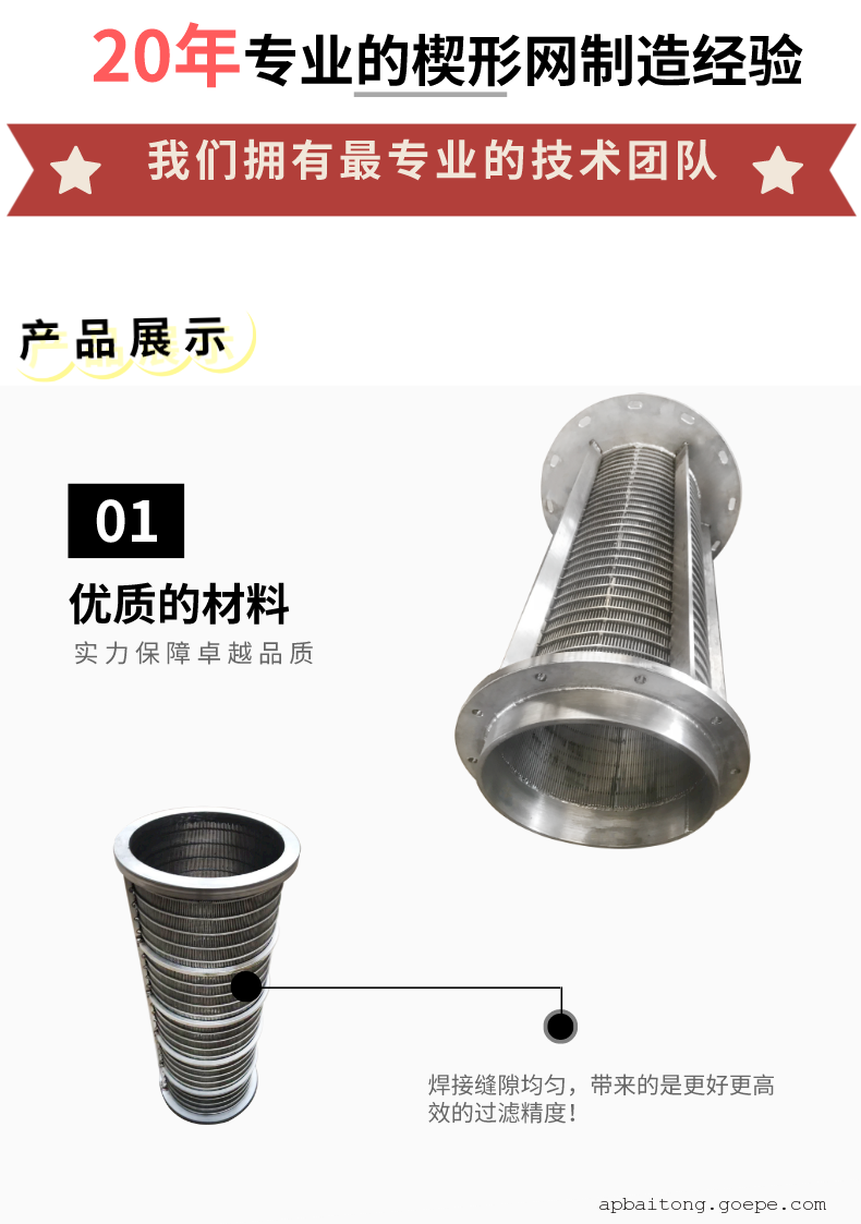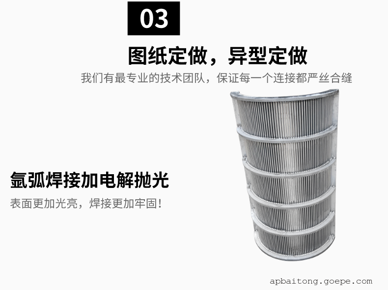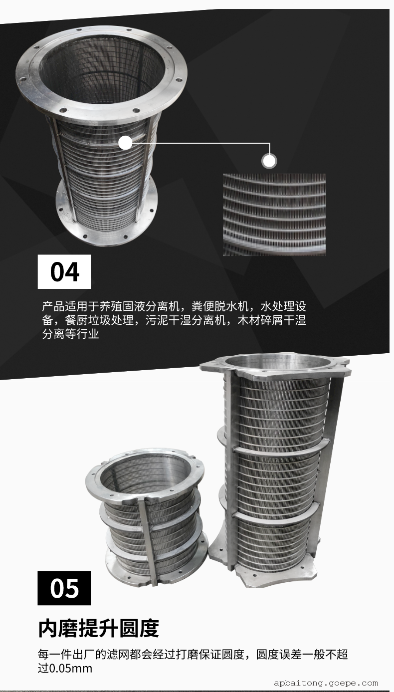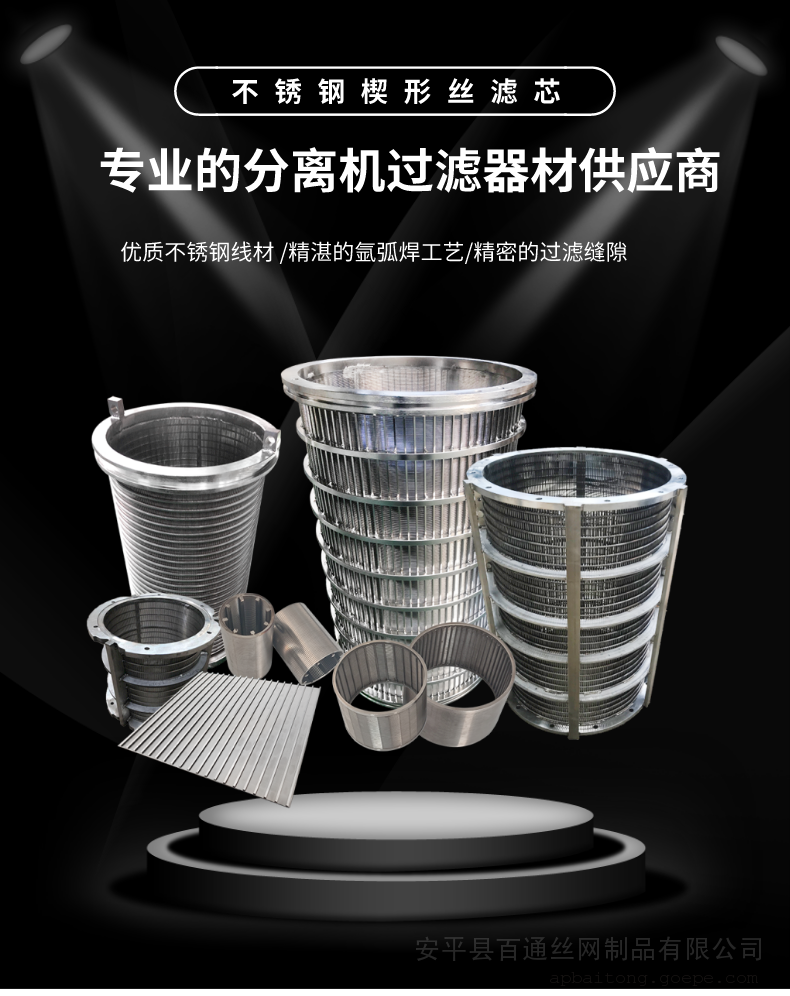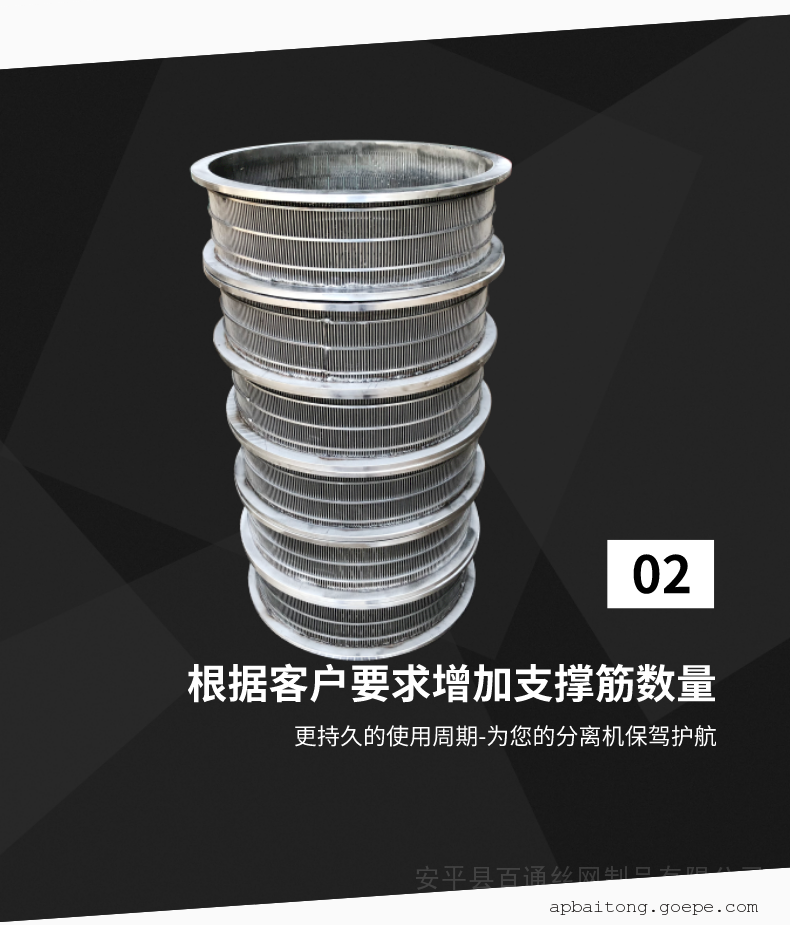 较强的机械强度,独立式结构,绝对精度过滤,楔形网*低过滤精度 25 μm增加了过滤面积、表面不易堵塞。整个楔形网是由楔形丝与支撑结构焊接而成。并行排列的楔形丝之间留有适当的行距,决定了过滤面积。我们以强大的生产能力为保障,可生产圆柱体滤芯(直径21mm-956mm,长度6米),也可生产平板滤网(楔形丝* 长:2800mmx4500mm)。此外,我们的丰富的生产经验与强大的生产设备使柏之瑞 RS滤网可满足不同的客户要求。